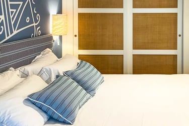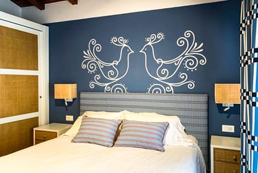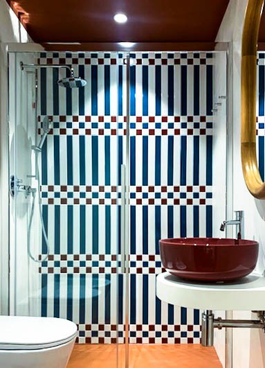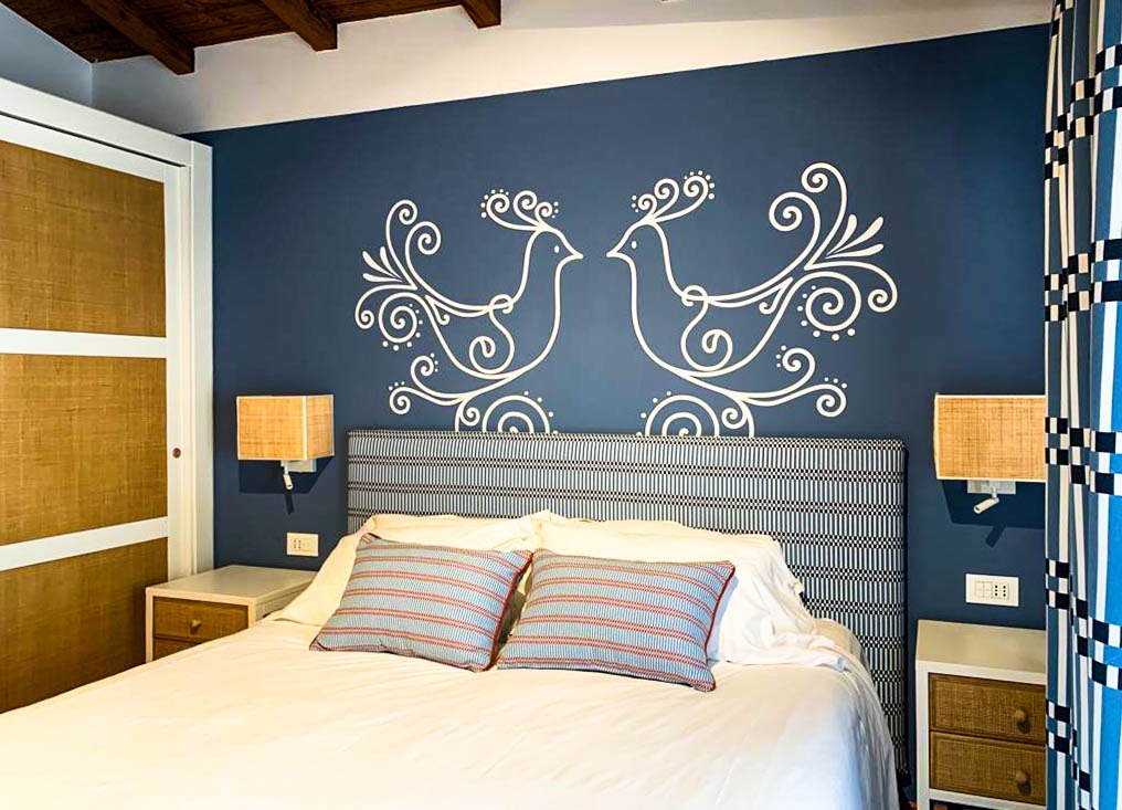 Blu e bianco costruiscono luce e ritmo, con accenti rosso-terra che scaldano l’insieme. Un interno essenziale, dove la decorazione diventa struttura.