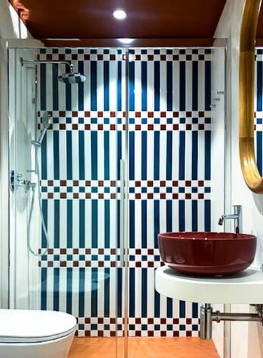 Blue and white shape light and rhythm, with terracotta accents warming the whole. A restrained interior where decoration becomes structure.