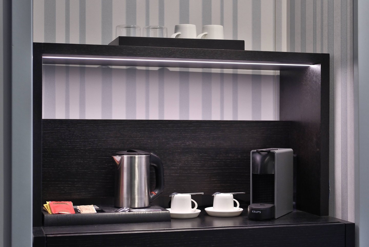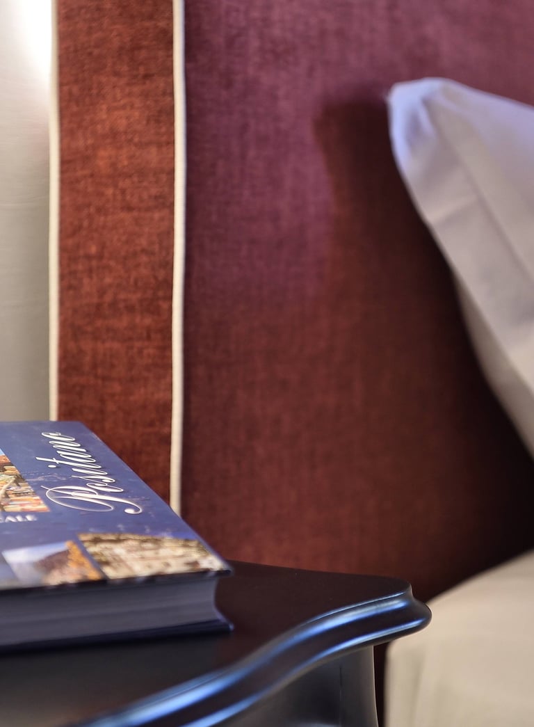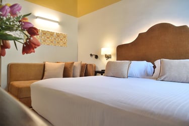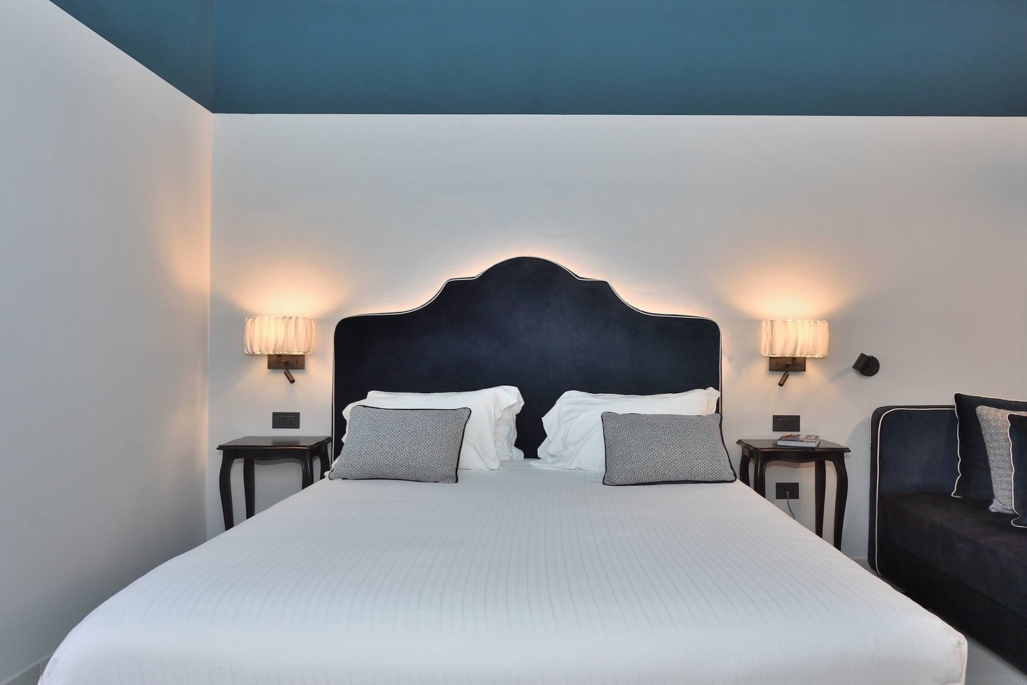 A Positano la luce e il colore diventano materia di progetto. Le camere traducono il paesaggio in un interno essenziale: pareti chiare come intonaco mediterraneo e soffitti-sky in tre varianti — blu mare, ocra solare, terracotta — che cambiano atmosfera senza cambiare grammatica.