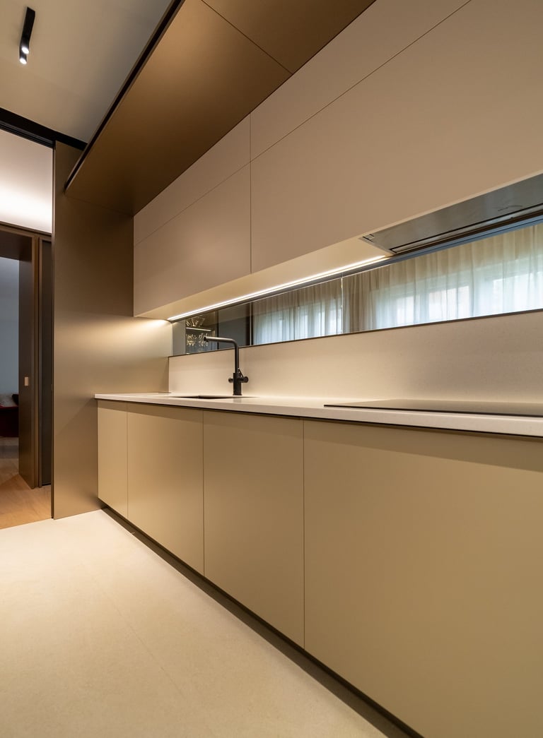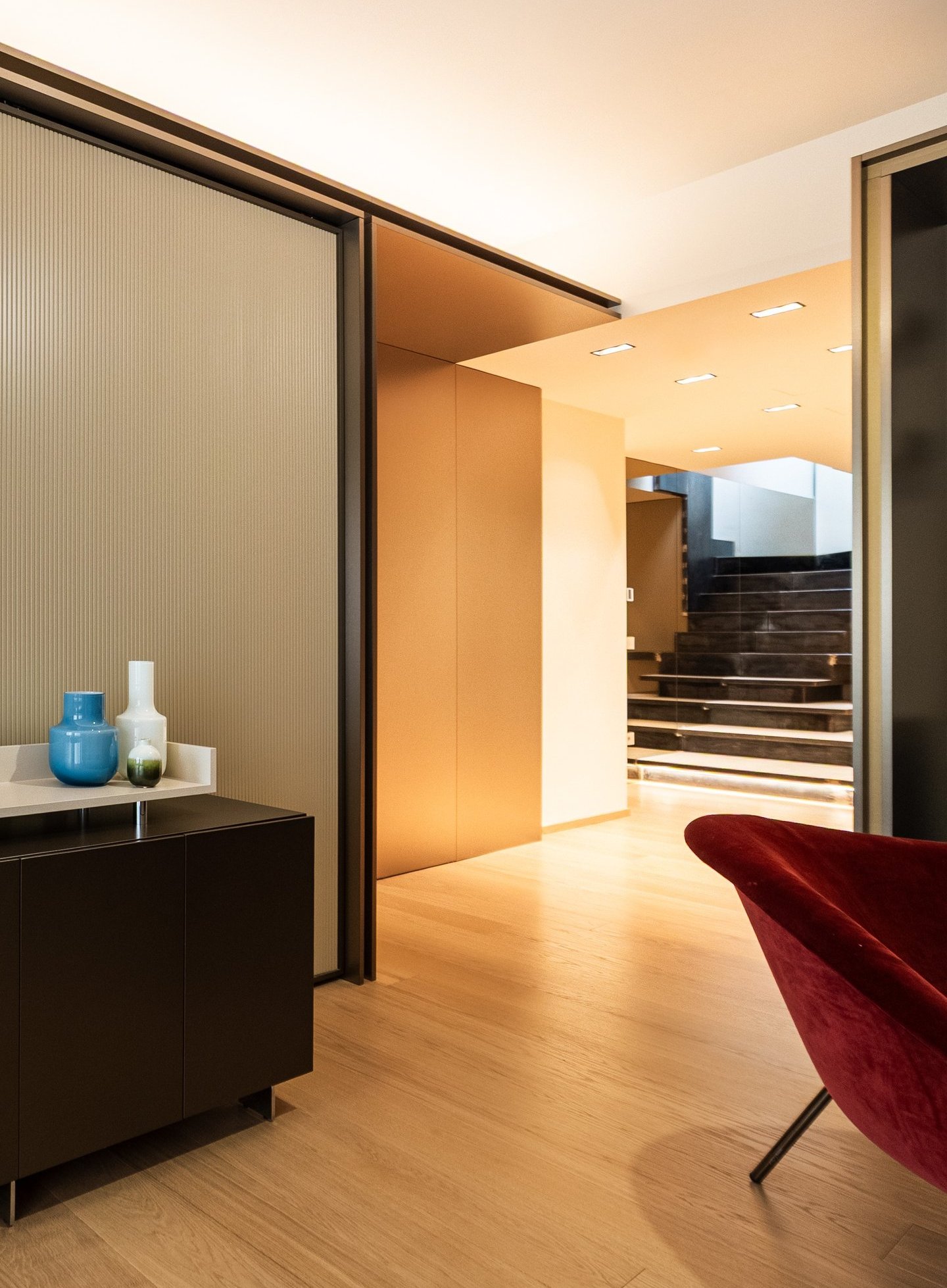 La casa è un omaggio a Palazzo Morisi, non solo per affinità di linguaggio ma per appartenenza: l’appartamento è ospitato al suo interno, e da questa condizione nasce il progetto. Un interno contemporaneo rilegge i codici dell’edificio con eleganza e precisione. Le cornici dei volumi d’arredo, disegnate con un profilo a doppia lama, trasportano nell’ambito domestico il ritmo dei brise-soleil di facciata, costruendo una continuità percettiva tra esterno e interno, tra pelle dell’edificio e scena abitata.
