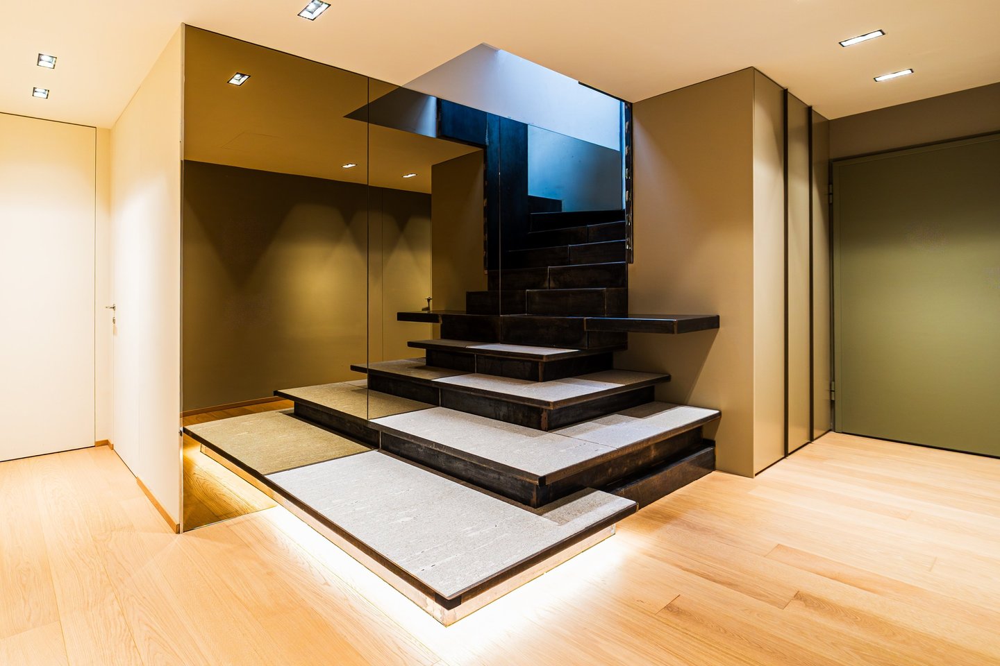La scala verso il terrazzo, raddoppiata da un grande specchio, si trasforma in un gesto scenografico: amplifica profondità e prospettive, dilata lo spazio e ne intensifica la percezione. Memoria e presente si intrecciano così in un progetto luminoso, essenziale e raffinato, dove ogni dettaglio è parte di un unico, coerente racconto.