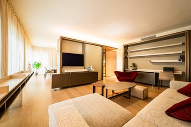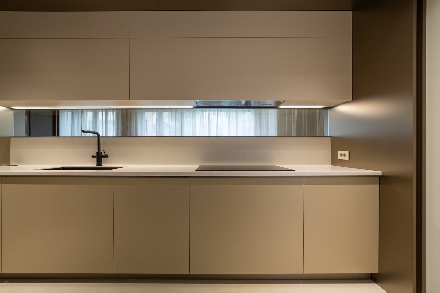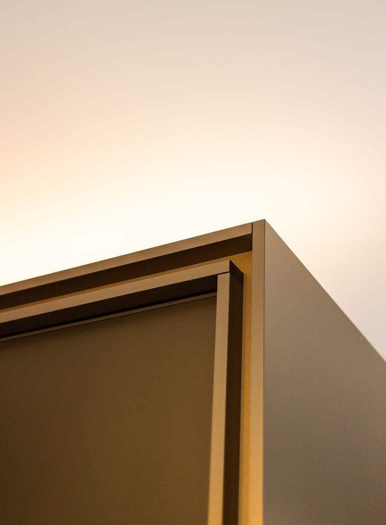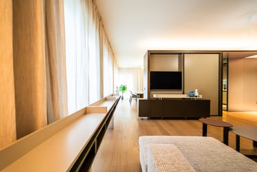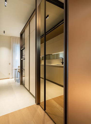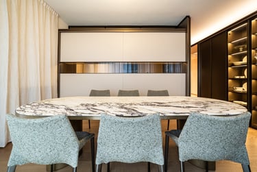 Casa is a tribute to Palazzo Morisi not only through affinity of language, but through belonging: the apartment sits within the building itself, and the project grows out of this condition. A contemporary interior re-reads the palace’s codes with elegance and precision. The framed furniture volumes, defined by a double-blade profile, translate the façade’s brise-soleil rhythm into a domestic key, creating a perceptual continuity between outside and inside—between the building’s skin and the inhabited scene.