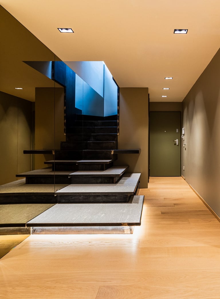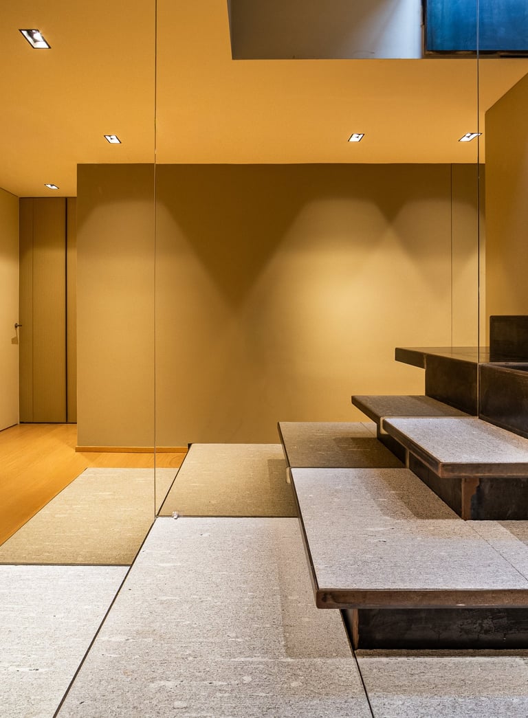 The stair to the terrace, doubled by a large mirror, becomes a theatrical gesture: it amplifies depth and perspective, expands the space, and heightens perception. Memory and the present intertwine in a luminous, essential, and refined project, where every detail is part of a single, coherent narrative.